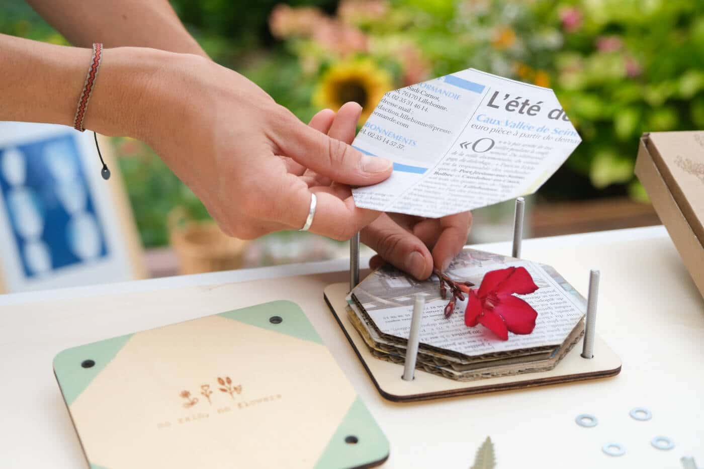 Chaque presse à fleurs est composée de deux plaques de bois et de vis papillon en acier. Des rondelles en métal évitent d’abimer le bois en serrant la vis. A l’intérieur de la presse, des intercalaires en papier et carton upcyclés servent à recueillir les végétaux. Ils absorbent l’humidité des plantes en train de sécher.